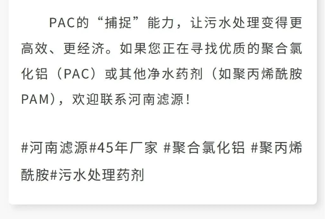 PAC如何“抓”住污水中的雜質(zhì)?揭秘污水處理的高效凈水劑! 咨詢熱線:15638187355 在線咨詢 產(chǎn)品詳細(xì) 上一篇:為什么電廠脫硫只用工業(yè)級(jí)PAC?90%貿(mào)易商不知道的真相 下一篇:《從渾濁到清澈:PAC過(guò)量投加的反效果與精確控制方法》 用手機(jī)看 拍下二維碼,信息隨身看 試試用手機(jī)掃一掃,在你手機(jī)上繼續(xù)觀看此頁(yè)面。